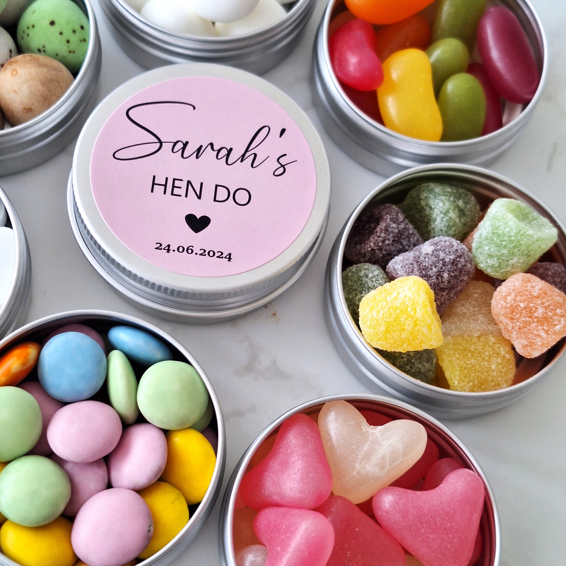 This is a listing for mini tins filled with your choice of treats and completed with best quality glossy personalised stickers.