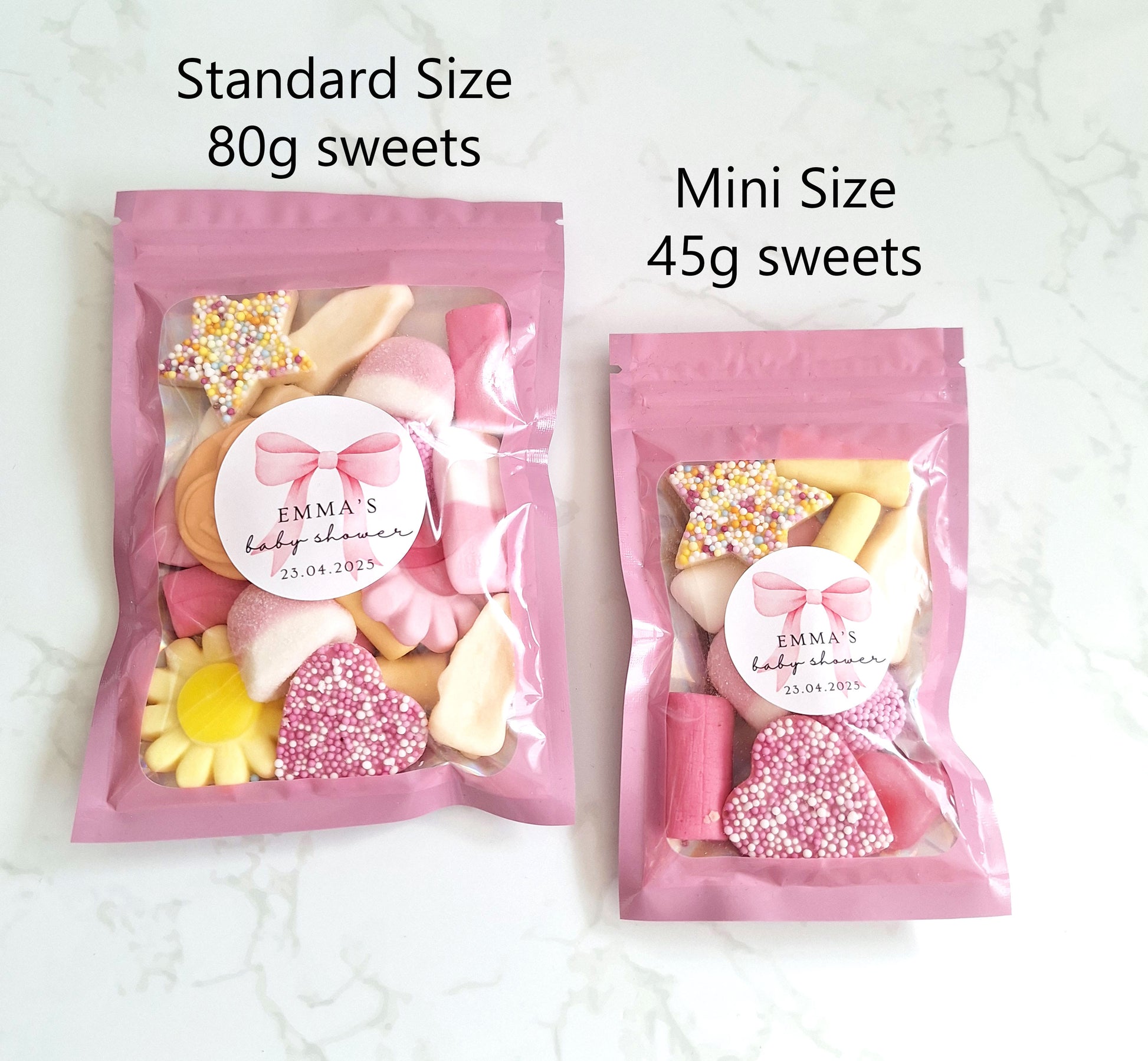 Make your baby shower even sweeter with our personalised baby shower sweet pouches, the perfect treat for your guests. These elegant custom favour bags come in two beautiful options: a pink bow for girls or a blue bow for boys, following the latest chic bow trend. Each pouch is carefully crafted in your chosen pink or blue colour and filled with matching colour-coordinated sweets, creating a cute yet stylish look for your celebration.