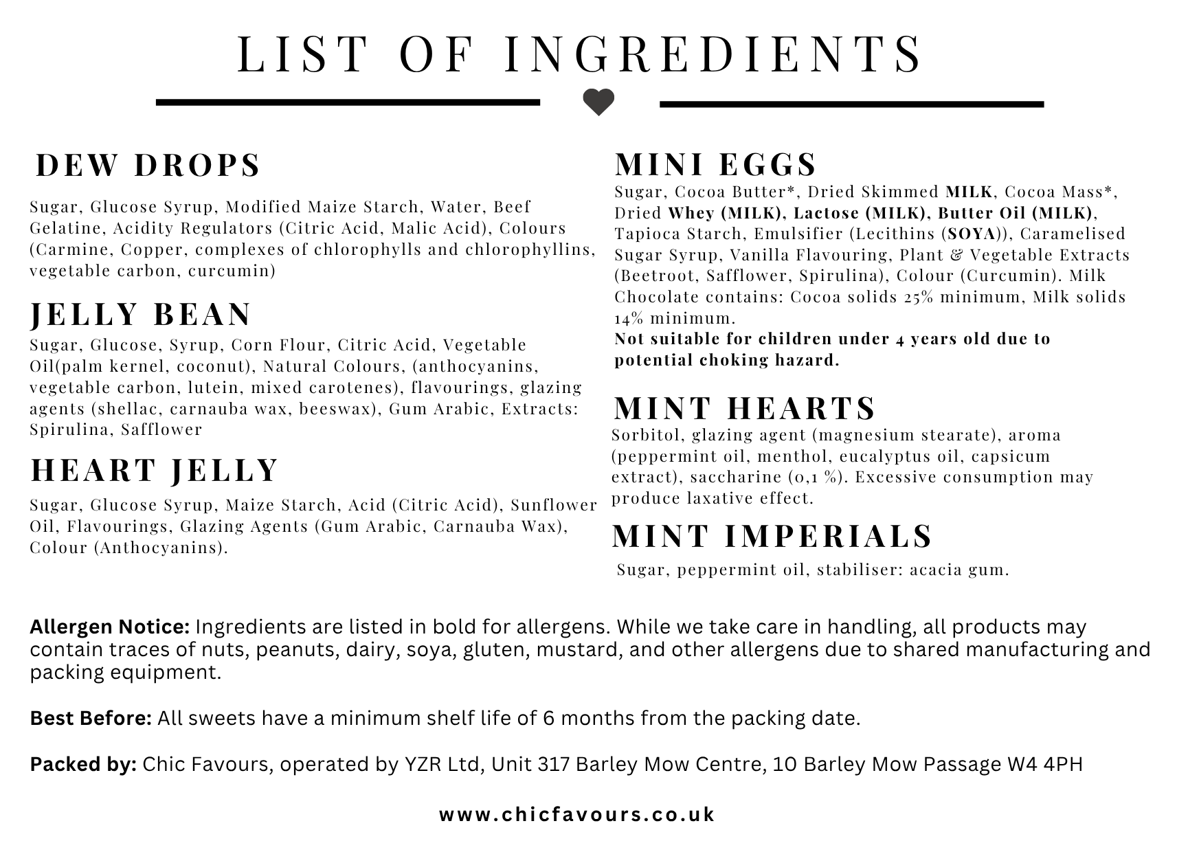 Please note that the sweets may contain or come into contact with gluten, milk, soya, nuts, and sulphites. I cannot guarantee that any sweets are allergen-free, as cross-contamination can occur during both manufacturing and packing processes — even if these allergens are not listed in the ingredients.