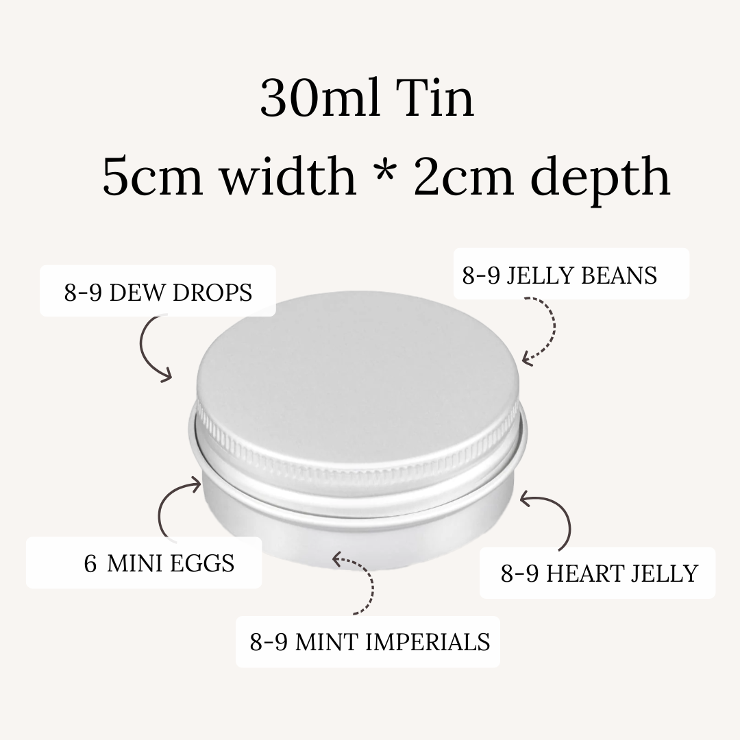 These mini tins filled with your chosen sweets and completed with best quality glossy personalised sticker, ready to give. Table favours would be perfect for